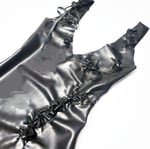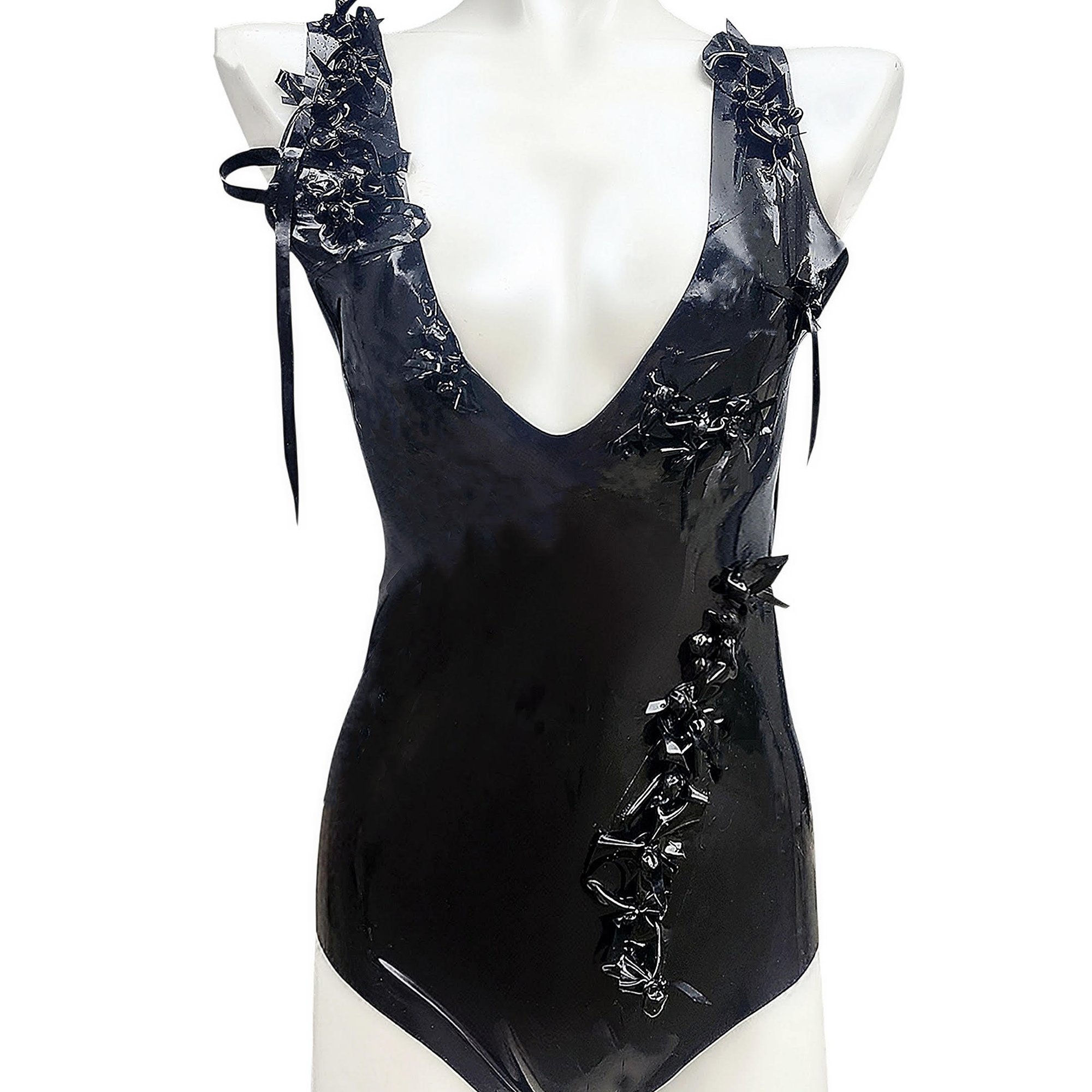 Here is the chic and one-of-a-kind bodysuit, the Cladonia. This bodysuit was created with our love of swimsuits and the natural world in mind, but specifically our fascination with moss and lichen. Using appliqué techniques, we made organic lichen-esque 3D latex shapes to wrap around the female form.