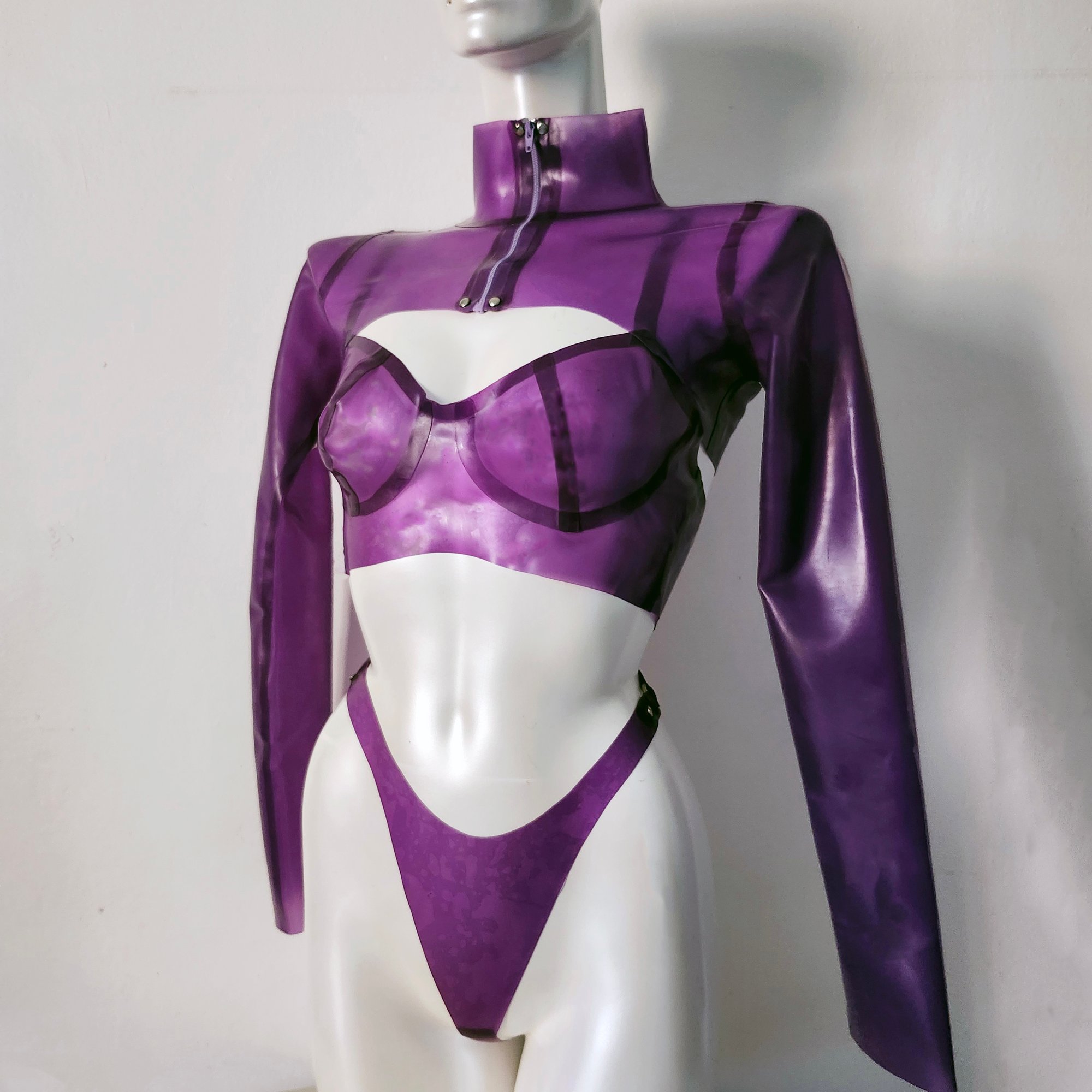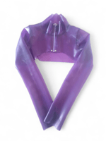 The Undine Bolero is made from a sumptuous semi-sheer purple latex. This long sleeve bolero is a perfect addition to the latex aficionado wardrobe as it both highlights the torso with a soft framing, but it also can also showcase the bra or pasties that are worn underneath.