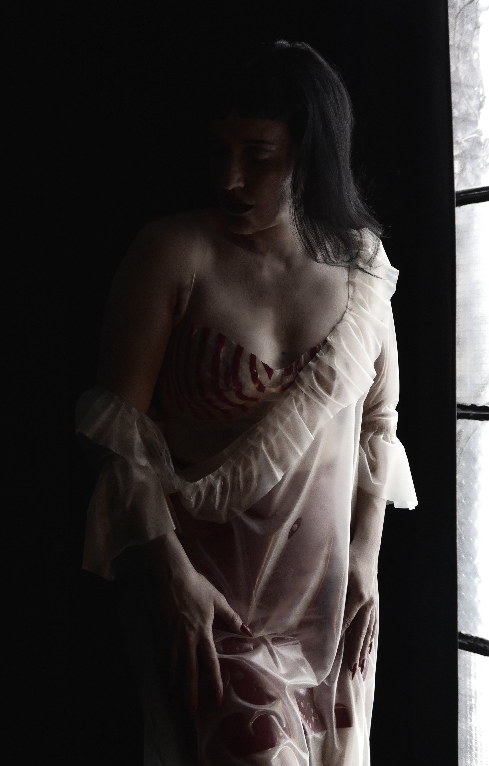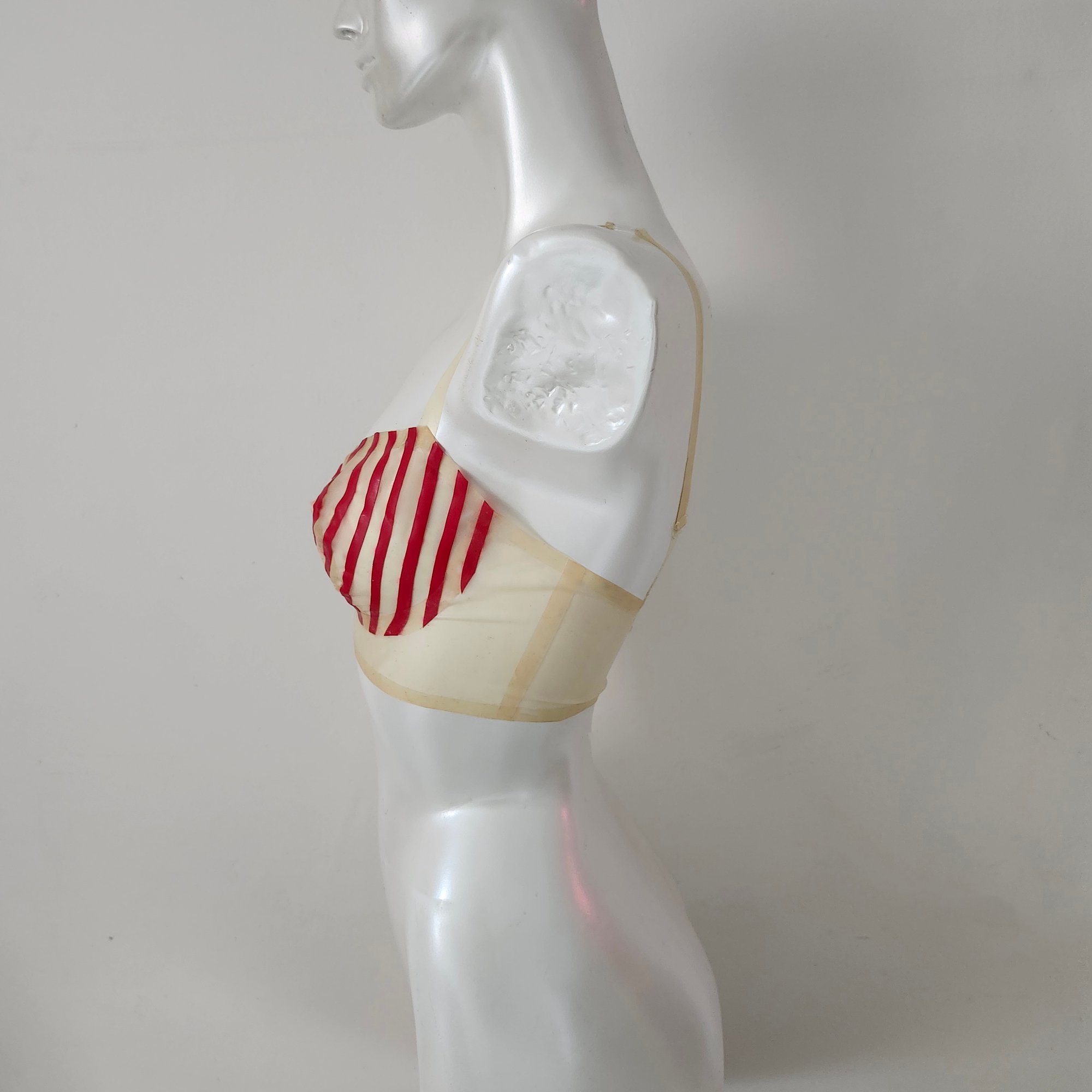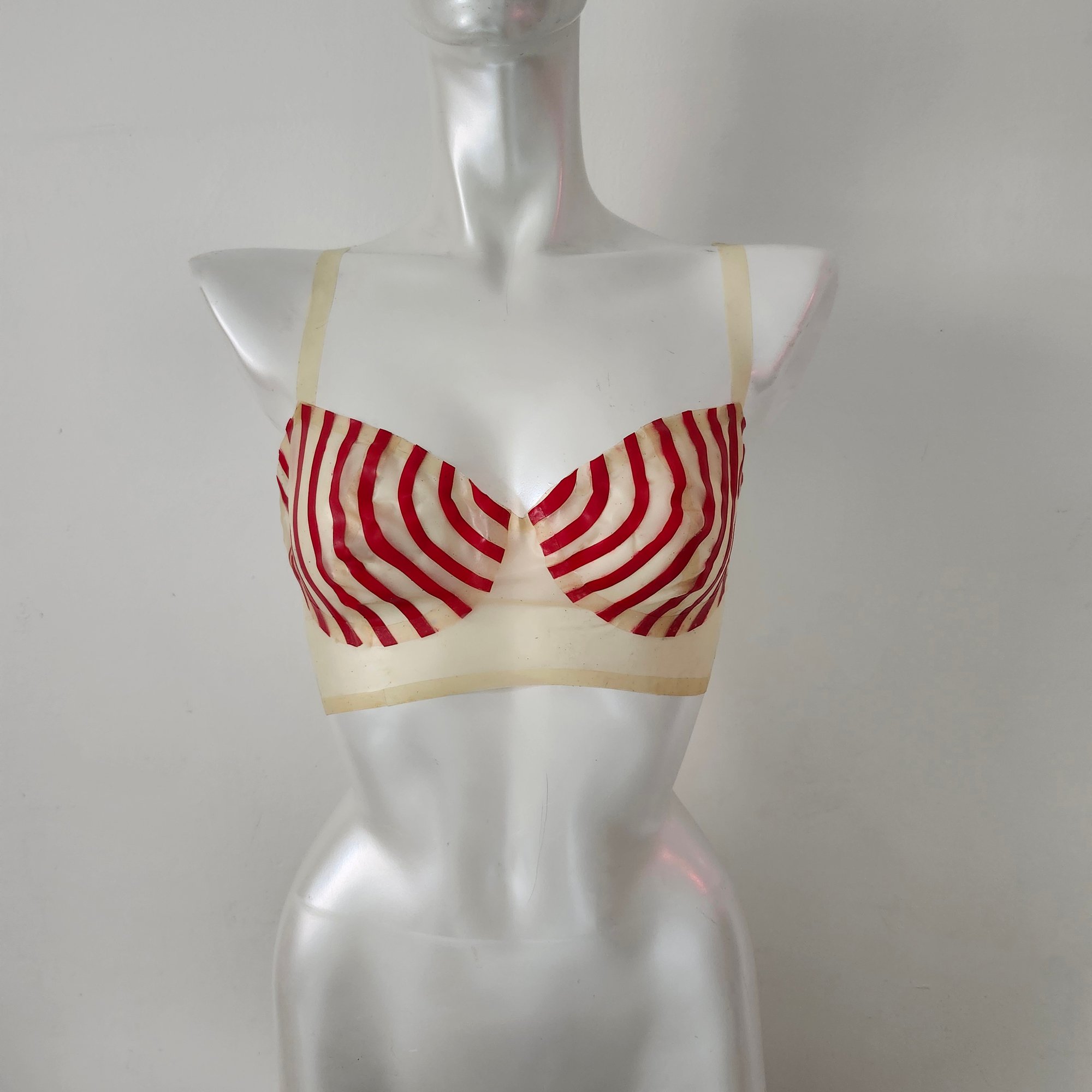Inspired by Burlesque, and cone bras of the mid-century, The Vaudeville bra exemplify the sexy and fun lingerie and stage clothes of the time. Made with lingerie feel latex in transparent bone and red, this bra is sure to look great on stage, in the bedroom, or out on the town.