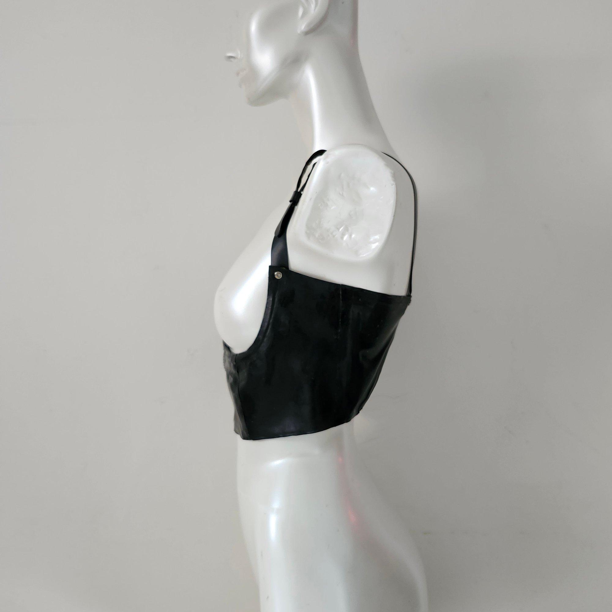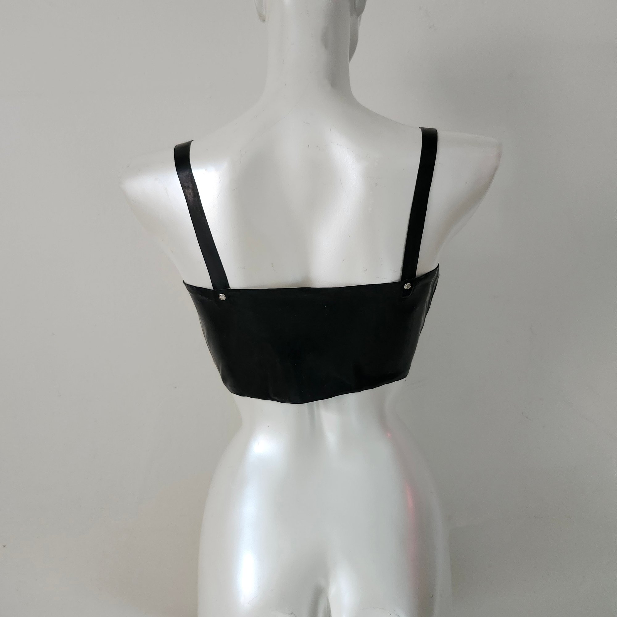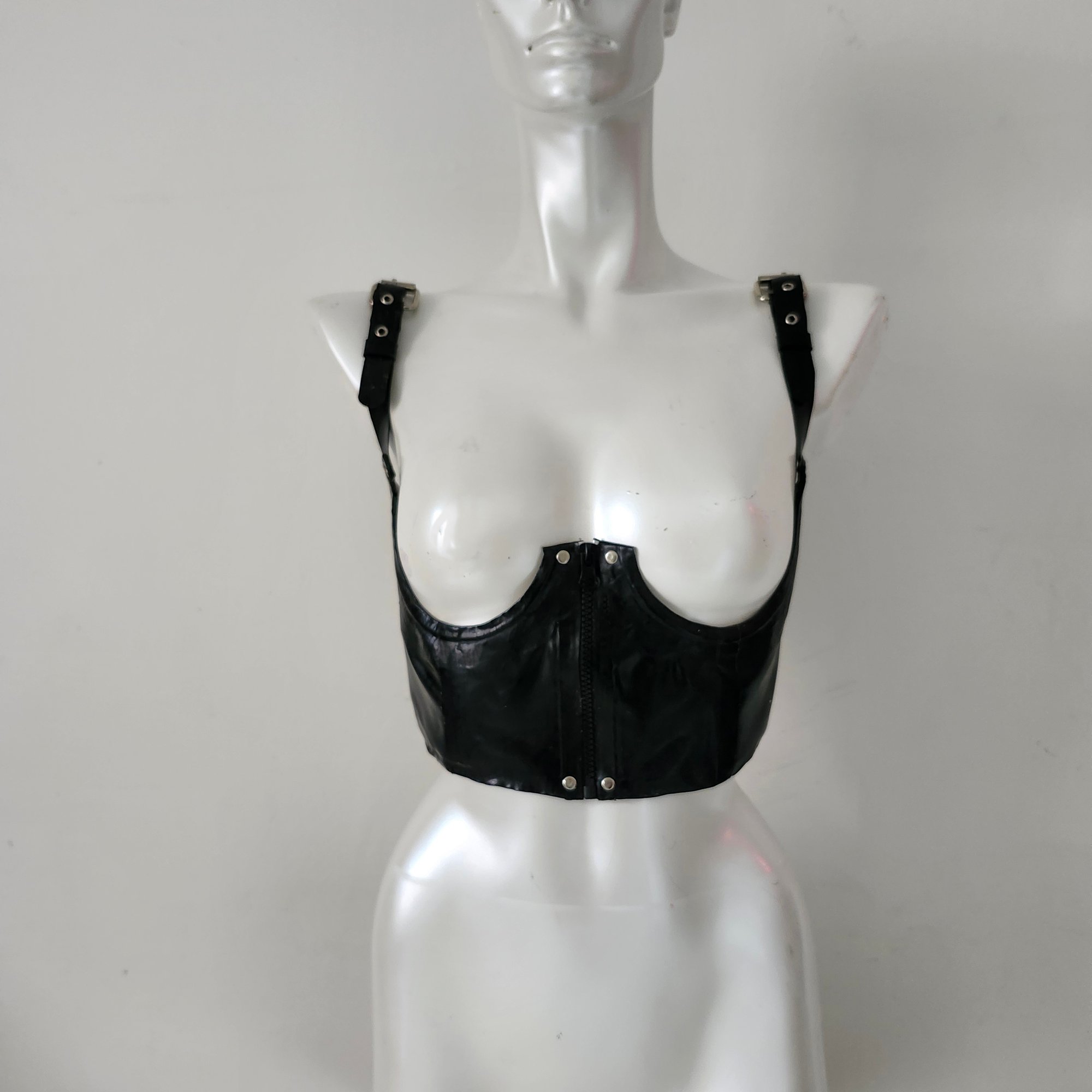 This piece boasts a boned and reinforced body, a front zipper with hardware detailing, as well as hardware at the adjustable shoulder straps. With latex garments we usually size down from your actual size for a body cinching fit.